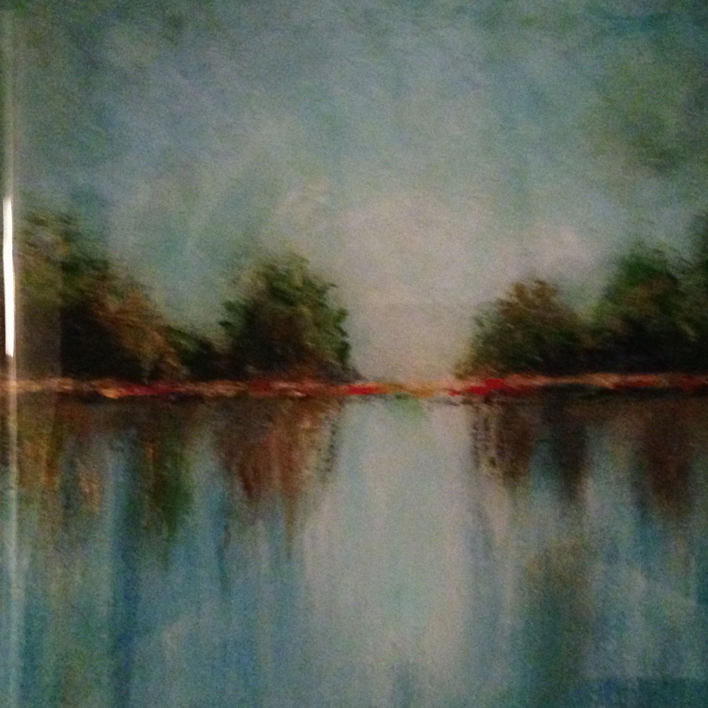 I wanted to try my hand at some more minimalist landscapes. As this one developed I used the same palette of blues, greens and white to form the sky and water but used tapping strokes in the sky in a kind of modified scrumble I hadn’t done before. Them I mirrored the colors with straight up and down stokes smoothed out and blended using a touch of water instead of the mere pressure that formed the sky. Once sky and water were in place adding the tree line and reflections was easy. I finished the land line with a few touches of gold and red.