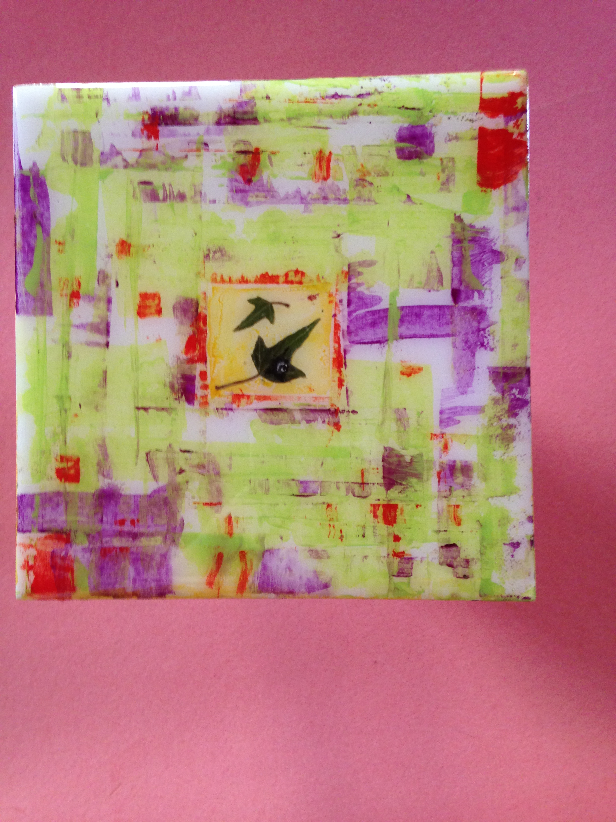 While I seldom use flowers in my pieces, when I do, my favorites are roses and carnations. Here, the tips of the little carnation petals seem to melt into the yellow background while the magenta edged white petals assert their presence. This little piece is only 4″ x 4″  I’m thinking a pair of these might work well as corners of a door frame. Hmm…