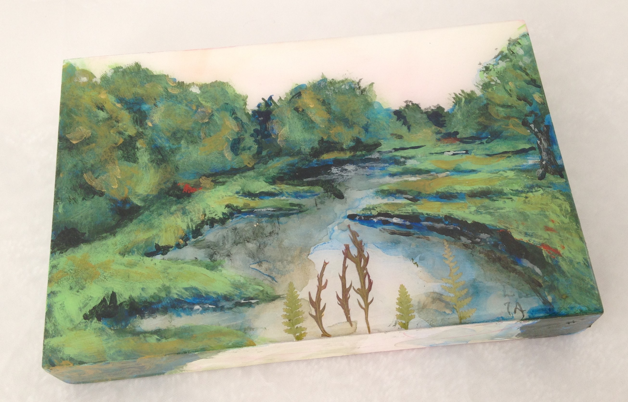 Resin is a wonderful way to preserve and enhance real botanicals, so I decided to try a few pieces on wood panel in order to provide the best possible surface for the ice-smooth resin coating. First, I painted my background on a 5″x 5″ panel. Then, I chose a plain mustard yellow for the 7/8″ sides of the cradle, and mounted my two sweet ivy leaves. Before coating the work with resin, I couldn’t resist adding a tiny ‘droplet’ of water on one of the leaves using more acrylic and a tiny signature brush.