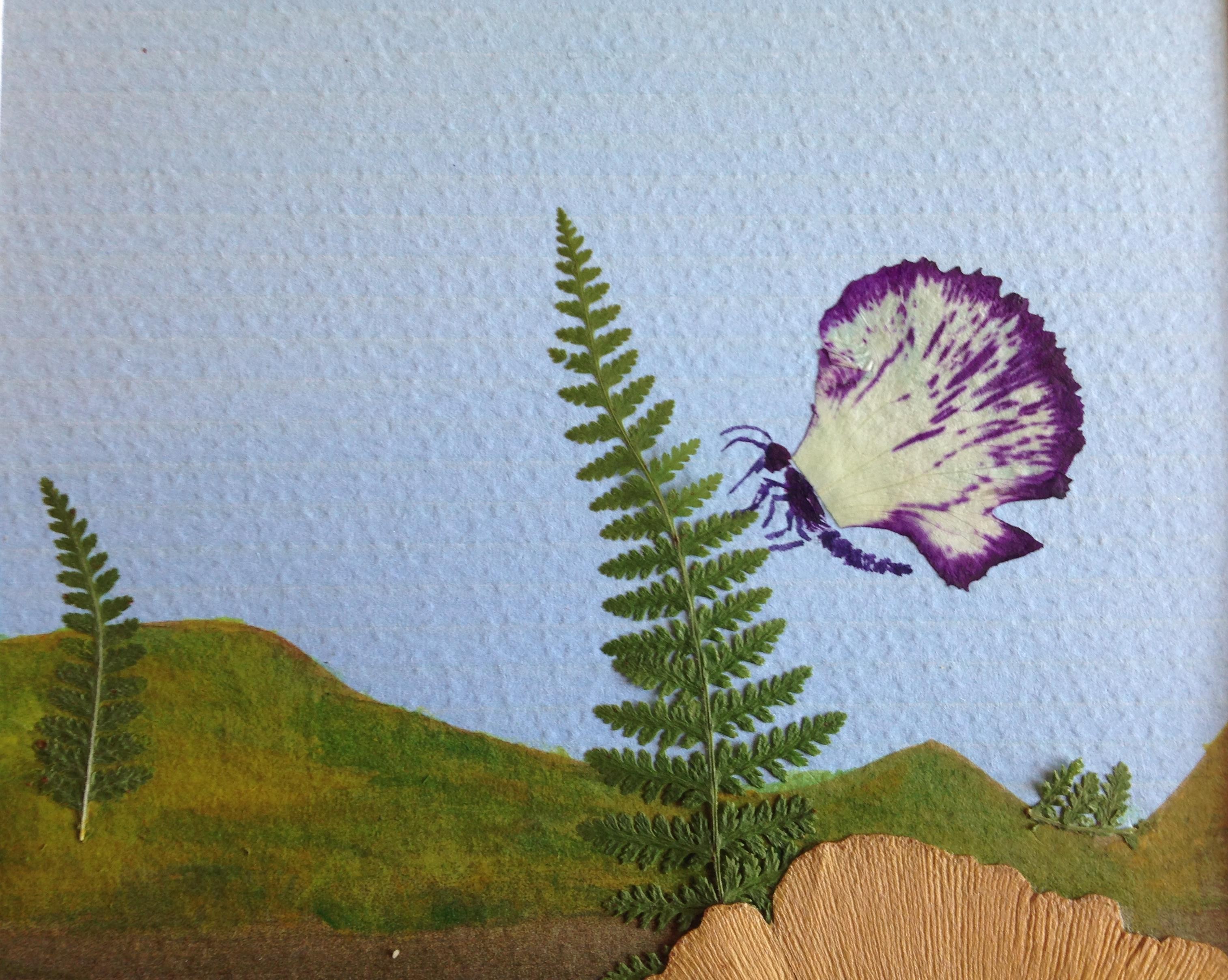 Having a great time with my new project but there’s a lot to protect. Note the latex gloves, and the waxed paper to protect my counter. Then there is the issue of my lungs. Need to upgrade to a full-on gas mask even though there are hardly any noticable fumes from the Envirotex two-part resin system I use. Better safe than sorry and I’m so happy with the process and results that I plan to gear up for a full series. This little guys are just 4″ x 4″. The abstract features azalea leaves and carnation petals, while the little landscape sticks to tried-and-true ferns. My next piece will be a boat at sea. Haven’t settled on what plant to use to represent land flora and sails. Last season, raspberry leaves made great sails, but, alas, my raspberry bush is not yet prepared to supply me with more.