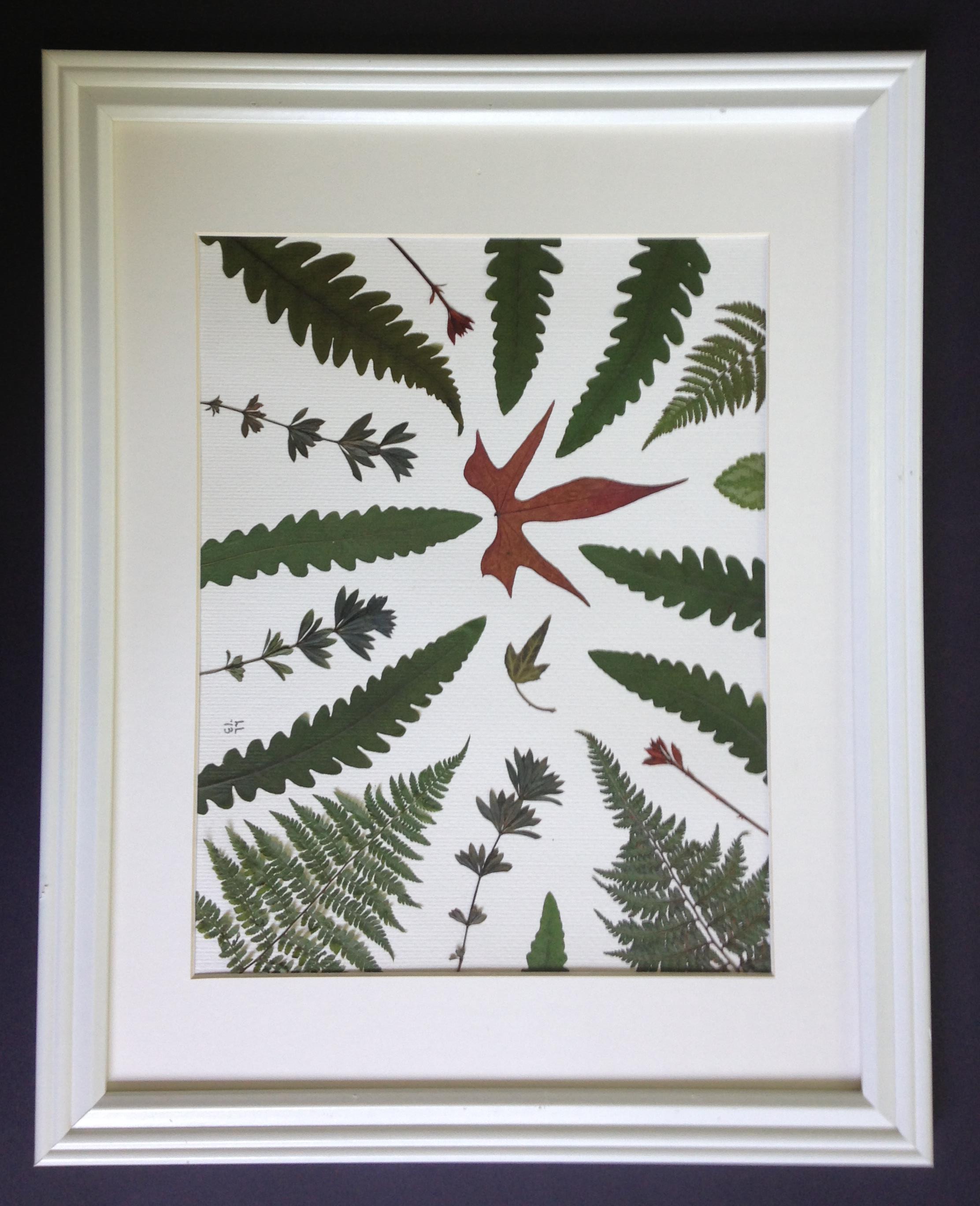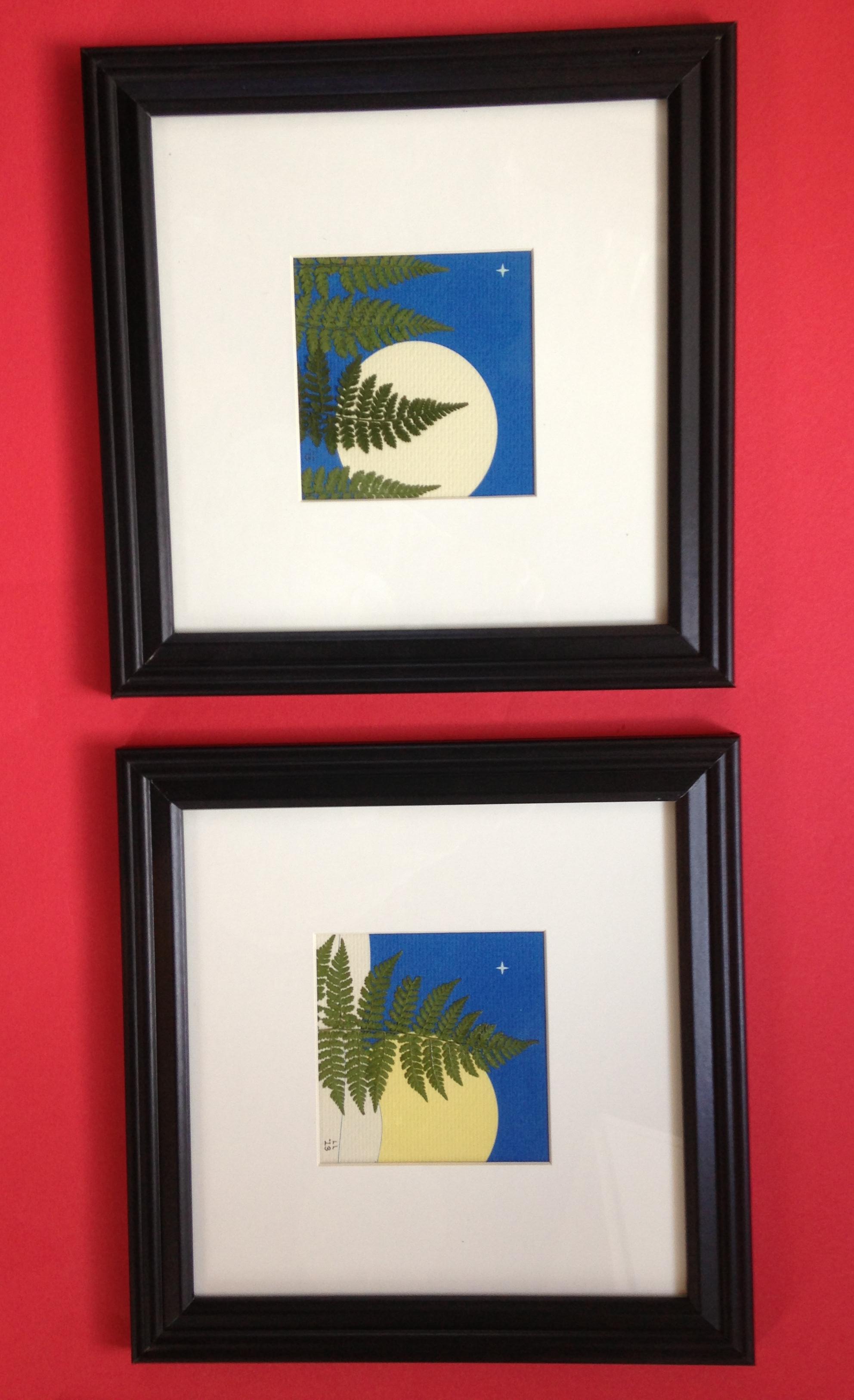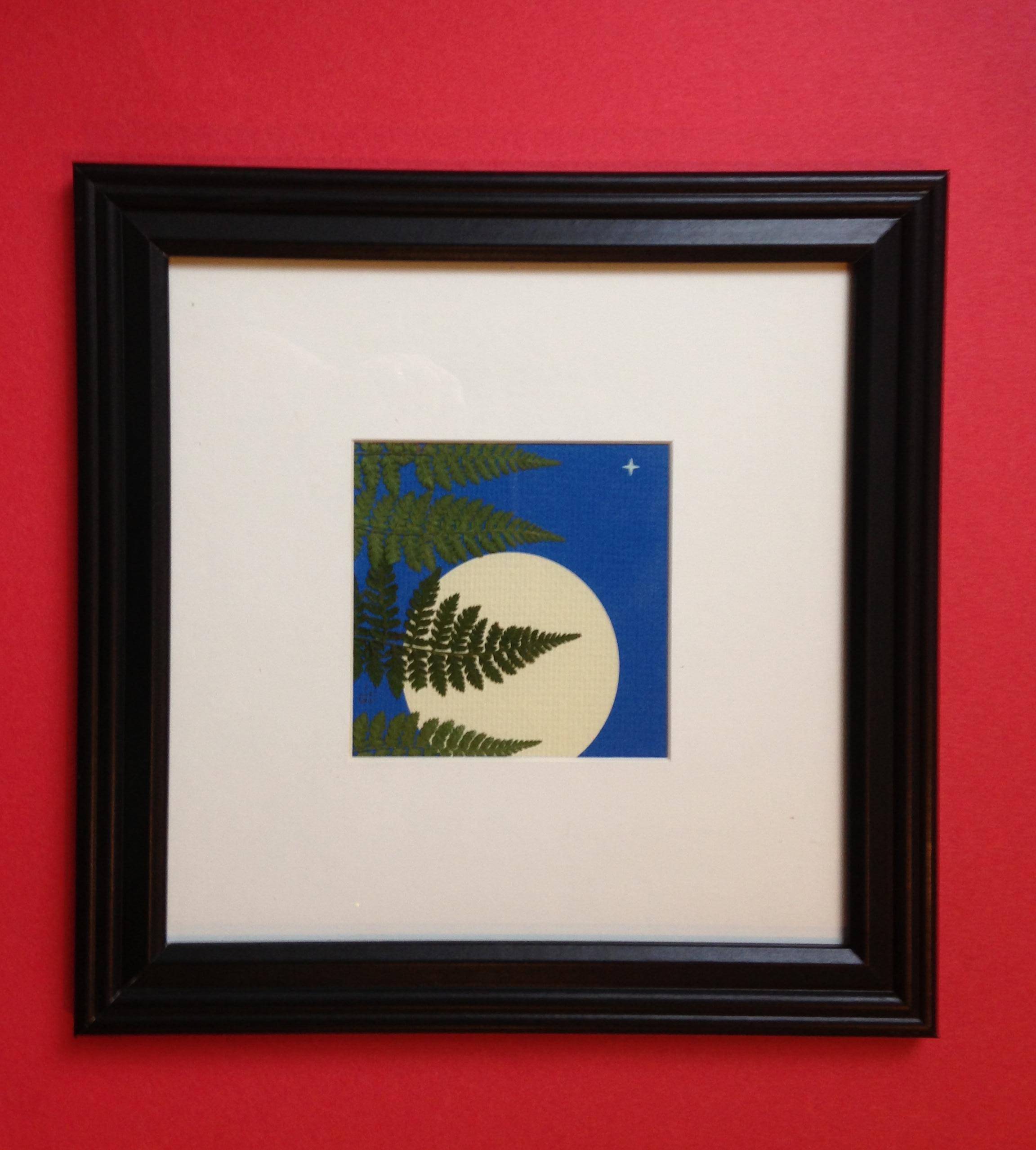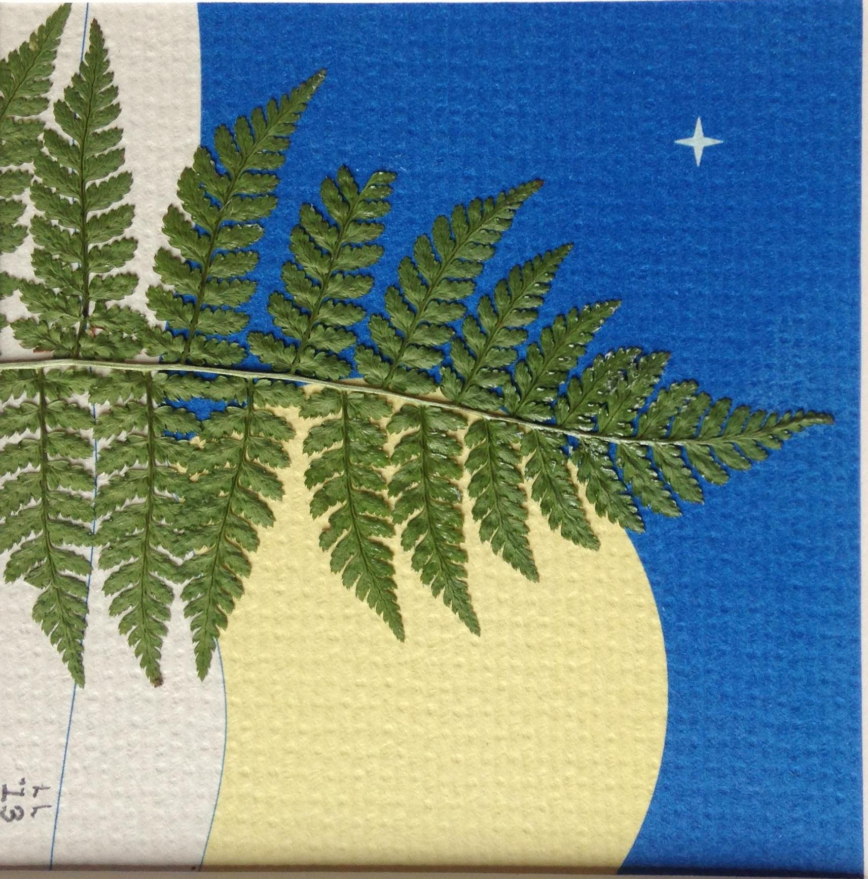 Just when I thought the supply of pressed ferns from last year’s garden had been depleted, I was walking the perimiter of my (1/4 acre) property and found these great green ferns which had actually thrived all winter, snow and all. They were growing under my hydrangea where I never remember seeing ferns in the past. I could hardly wait to process them and get to work. Here is the first result. I have one double-headed one that will eventually make it into a larger composition. You can see I used the lighter back side of three of the fronds better to show up against the night sky. I’ve already completed the graphic for a companion piece that will have a wintery aspect. Maybe tomorrow. See the rest of this growing collection here.