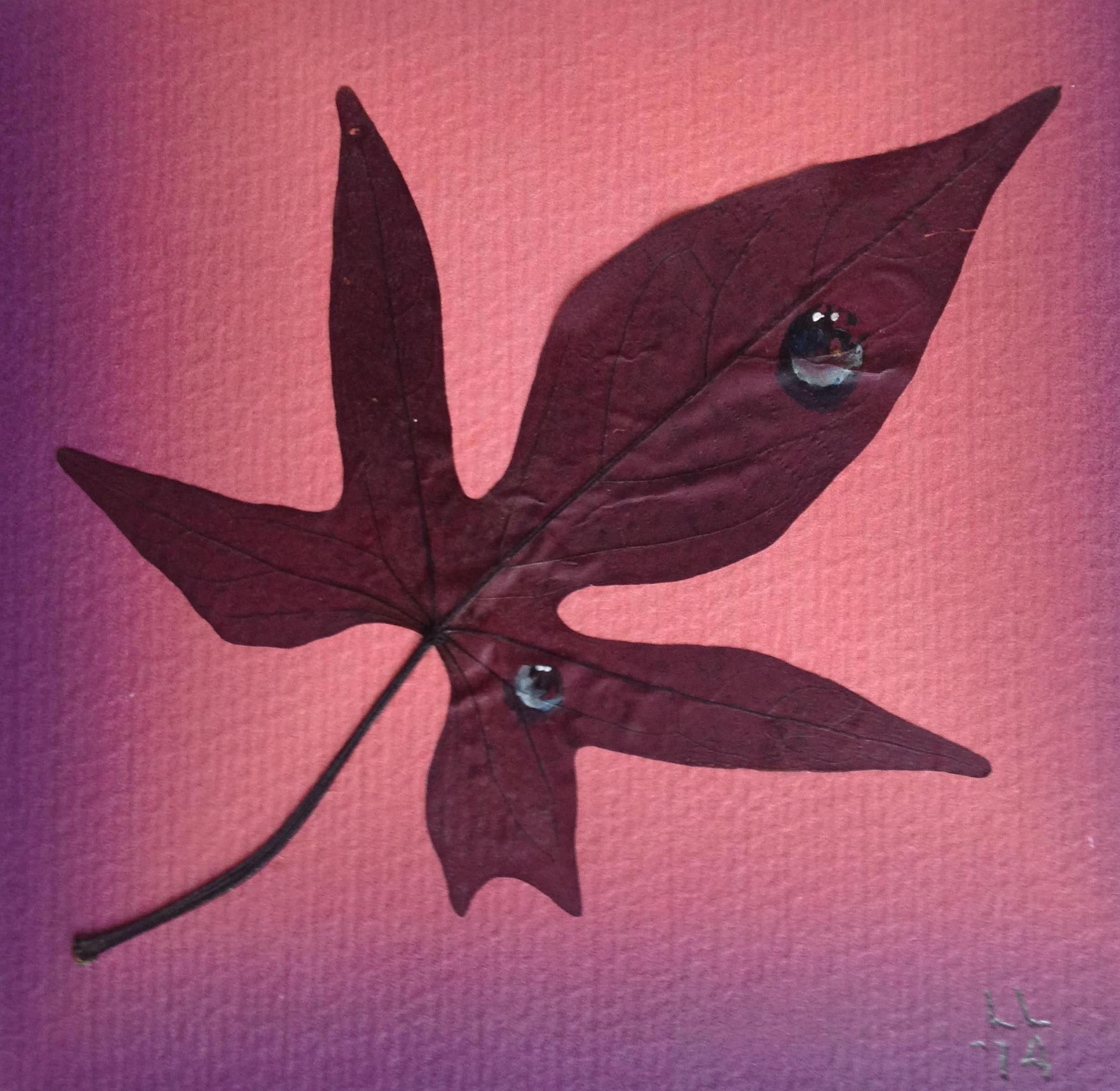 I’ve recently made a few pieces that include water drops in the background including this little composition using real ferns so it’s not that big a leap to work directly on a leaf. This dramatic sweet potato leaf made the perfect canvas for this experiment.