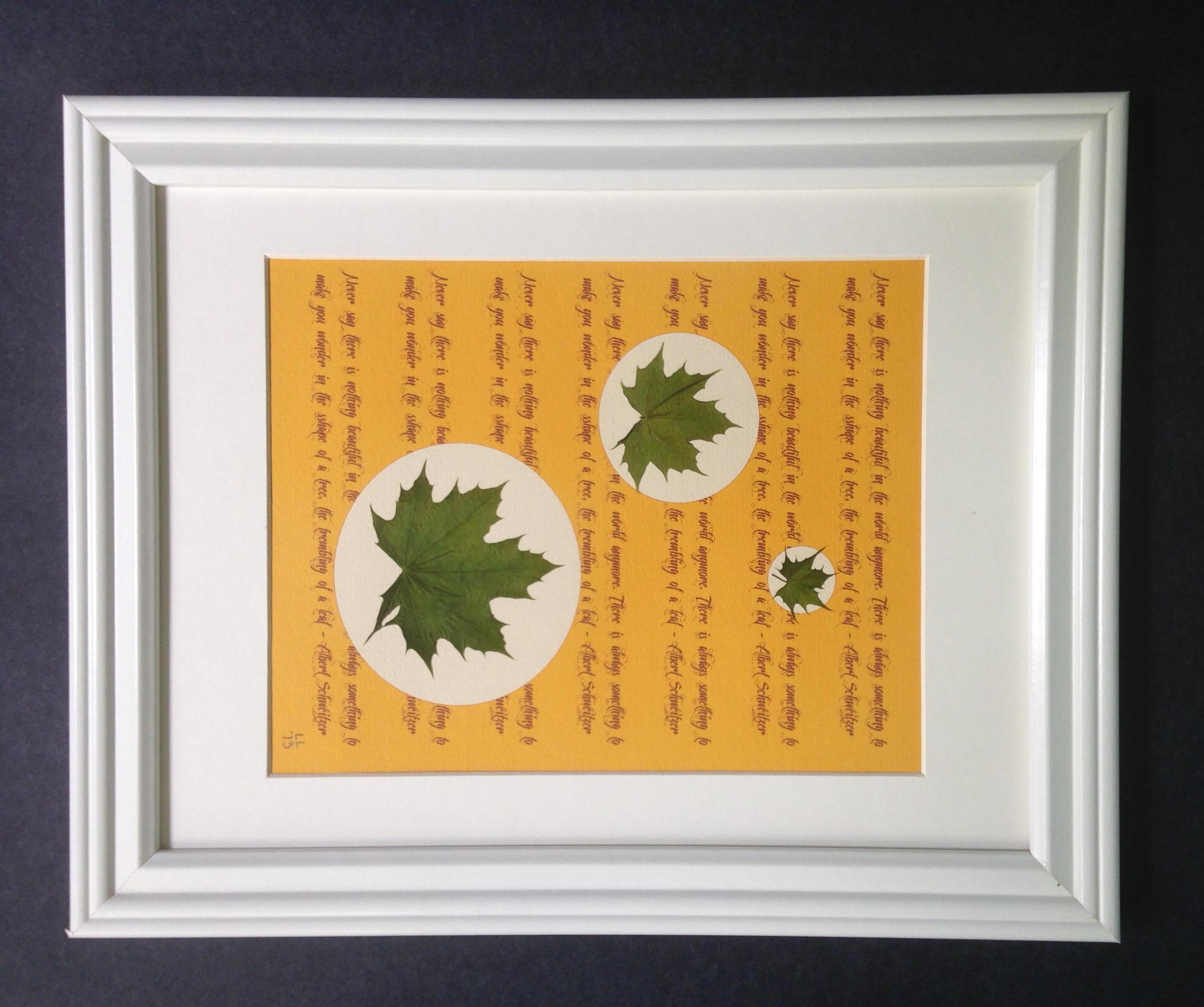 The background graphic above which these three bubbles of maple leaves float is a quote by Albert Schweitzer: “Never say there is nothing beautiful in the world anymore. There is always something to make you wonder in the shape of a tree, the trembling of a leaf.”