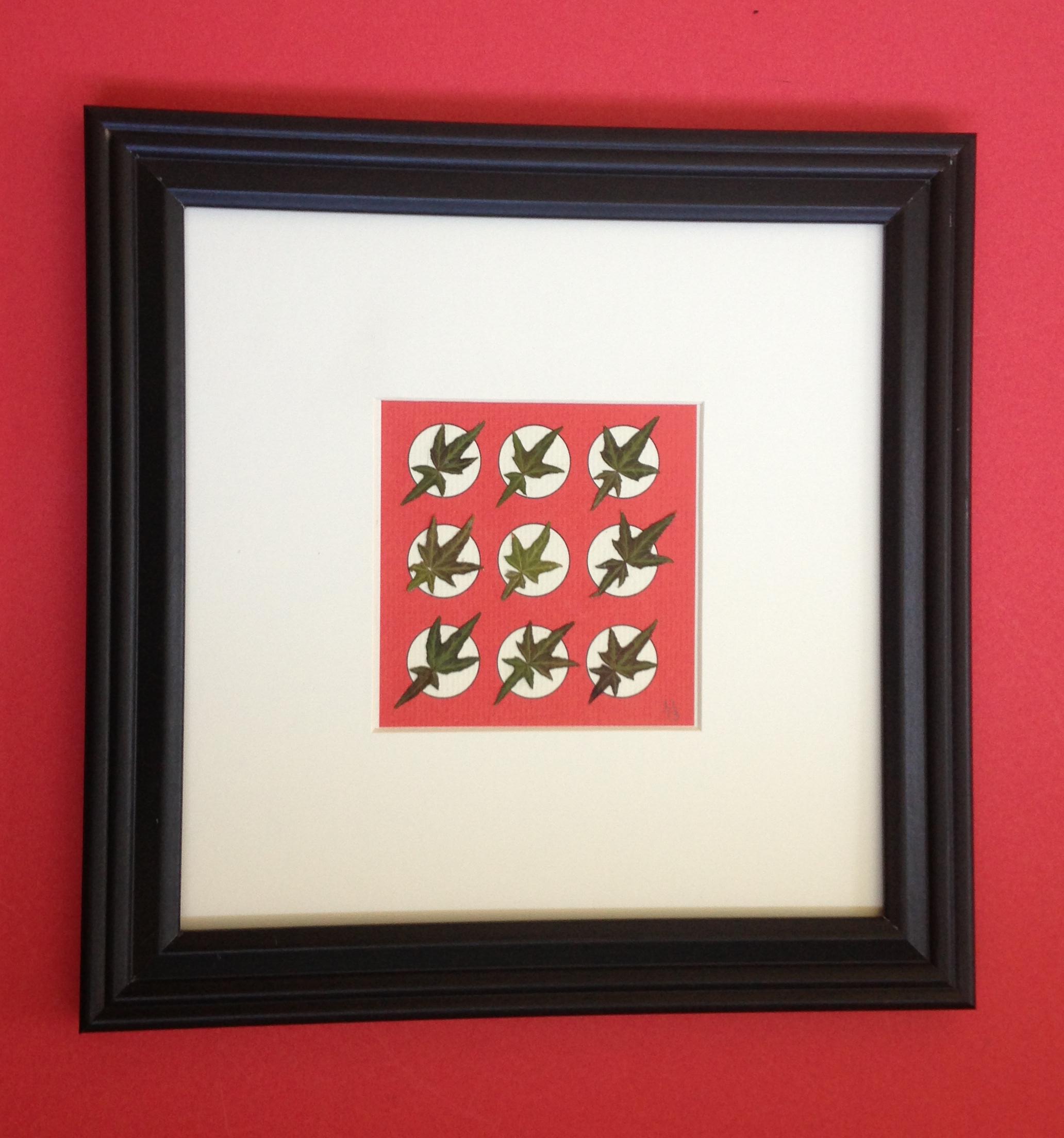 Meanwhile, work continues on my new project – pressed botanicals on acrylic backgrounds. For these I use wood panels as supports, and encase the finished work in two or three coats of two-part resin. This one features a single feathery Japanese maple leaf and awaits its second coat of resin. Out with the gas mask…