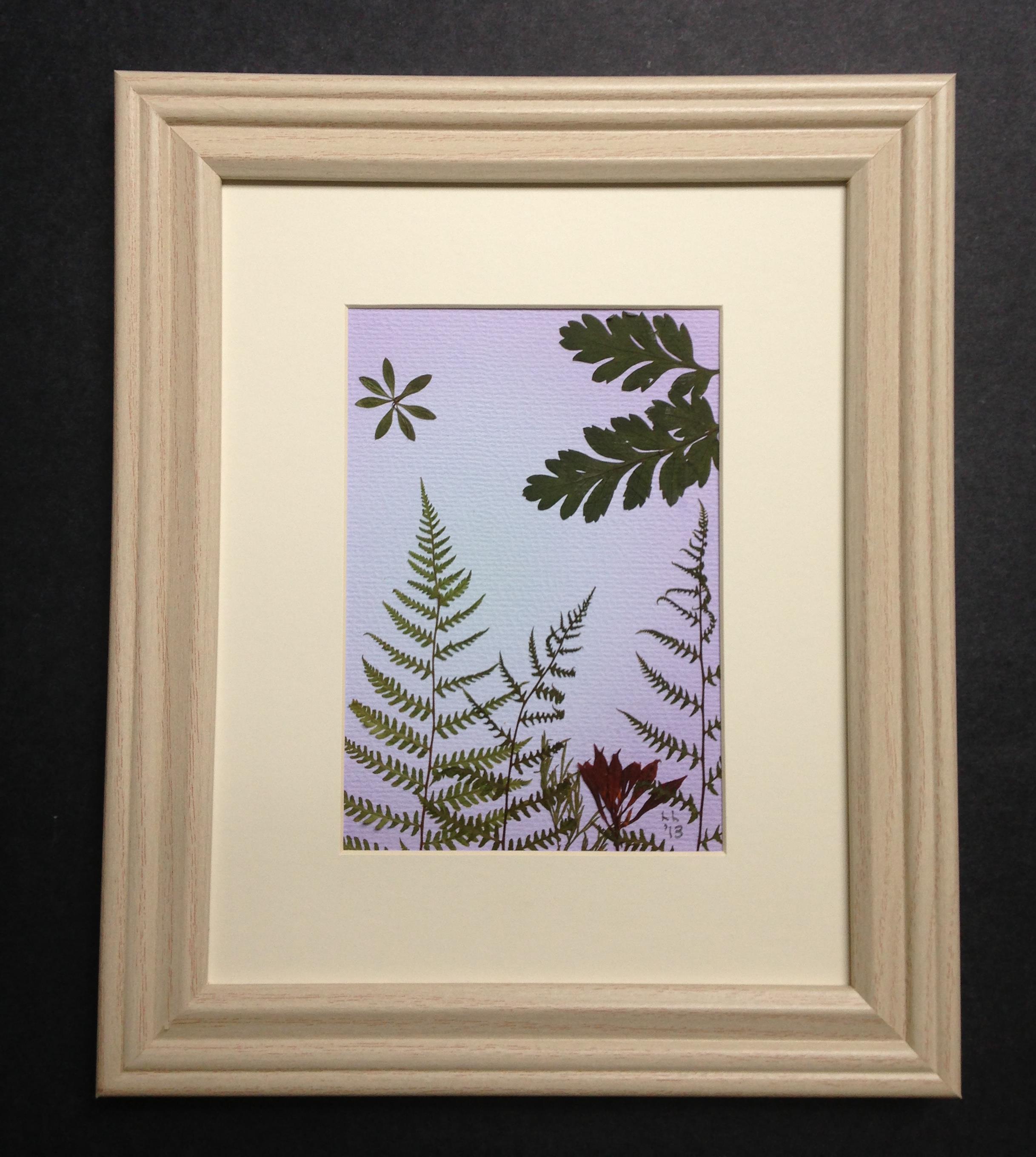 The second piece rounds out the series of landscapes I have built over the last few months. This one is meant to represent daybreak. the moon is still visible but the sun is about to burst about the horizon. The ‘tree’ in the foreground — in reality, a scented geranium leaf — is bare of leaves, yet the grass is still green and the hills in the background, spotted by evergreens, have not yet turned from blue to wintry gray.